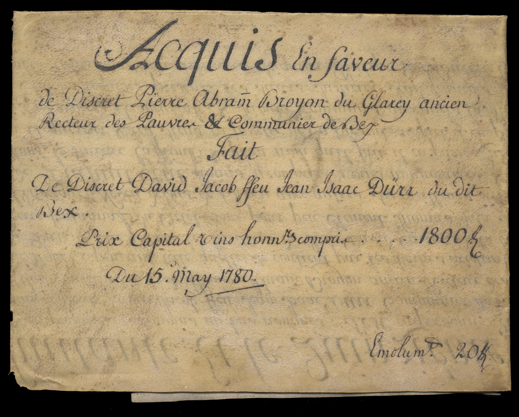 Acquis en faveur de Discret Pierre Abram Broyon du Glarey, ancien Recteur des Pauvres et Communier de Bex. Fait De Discret David Jacob Feu Jean Isaac Dürr dudit Bex. Du 15 may 1780