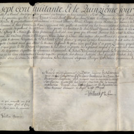 L'an Mille sept cent huitante. Et le Quinziéme jour du mois de May, Devant moi Notaire public et Curial soussigné & en présence des témoins au bas nommés ; S'est en personne Etabli Provide et Vertueux Ferdinand Genet, Chatelain de Bex, agissant par les pouvoirs que lui a donné Discret David Jacob feu Jean Isaac Durr Communier de Bex qu'il lui fera ratifier, ainsi au nom dudit Durr & pour lui & ses biens : A vendu & perpetuellement abandonné à Discret Pierre Abram Broyon Recteur des pauvres dudit Bex, ici present & acquérant pour lui & les siens : savoir l'environ de trois fossoriers de vigne, cependant telle qu'elle se contient par les bornes existantes située au vignoble de Partiaz, lieu dit En Grand Champ terroir du dit Bex, procedée du paternel dudit Durr : Que jouxte les heritiers de Jean David Carraz de la Ruaz de Bex du Levant ; la femme de Jean Anthoine Pièce née Monnet du Glarey & Marie feu Pierre Fontannaz du Crétel, avec pour peu Clement Thomas de la Scie du Couchant : Le pré dudit Thomas dessous du Vent : et Marie Durr soeur du vendeur femme de l'Enseigne Neveu dessus de Bize : avec autres ses meilleurs s'il en existe, ensemble le fonds & ce qui en dépend. Et a été faite cette Vente pour le prix & somme Capitale de dix huit cent florins, y compris les vins honnoraires & c'est outre les frais fait à forme de la pratique lequel prix d'Acquis a été acquité contant ainsi que Monsieur le vendeur l'affirme & qu'au nom qu'il fait il en passe Quittance perpétuelle audit acquereur & aux siens se devetant en outre de ladite vigne pour le dit Broyon Acquereur & les siens en invetir dès à présent, auquel il en porte due maintenance à l'obligation des Biens dudit Durr, vu qu'à l'avenir ledit acquereur suportera les redevances Seigneuriales & Tributs Communs auxquels la vigne vendue est assujetie selon Droit : Ainsi fait & passé au Logis de l'Ours audit Bex sous autres clauses requises, présents les sieurs Justicier Jean François Ruchet de la Ruaz, et Jean Pierre Ruchet son frère dudit Bex, témoins. Expédié sous le sceau du Noble Genereux & très honnoré Seigneur Philipe De Buren, Gouverneur des quatre Mandements d'Aigle, près le seing de moi dit notaire.