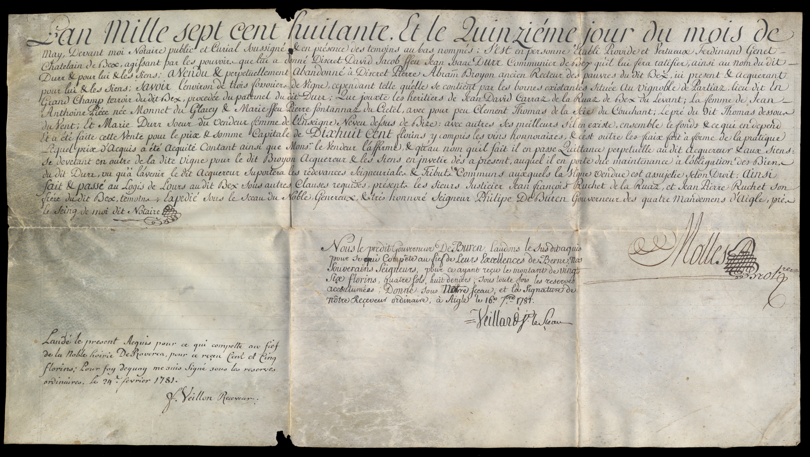 Acte de vente sur vélin daté du 15 mai 1780, dans lequel Ferdinand Genet, châtelain de Bex, vend au nom de David Jacob Durr une parcelle de vigne de trois fossoriers située au vignoble de Partiaz à Pierre Abram Broyon, recteur des pauvres de Bex. Le prix de vente est de 1800 florins, déjà payé en totalité. L'acheteur, Broyon, s'engage à entretenir la vigne et à payer les redevances seigneuriales associées. La vente est attestée par des témoins et validée par le notaire sous le sceau du seigneur Philippe De Buren.