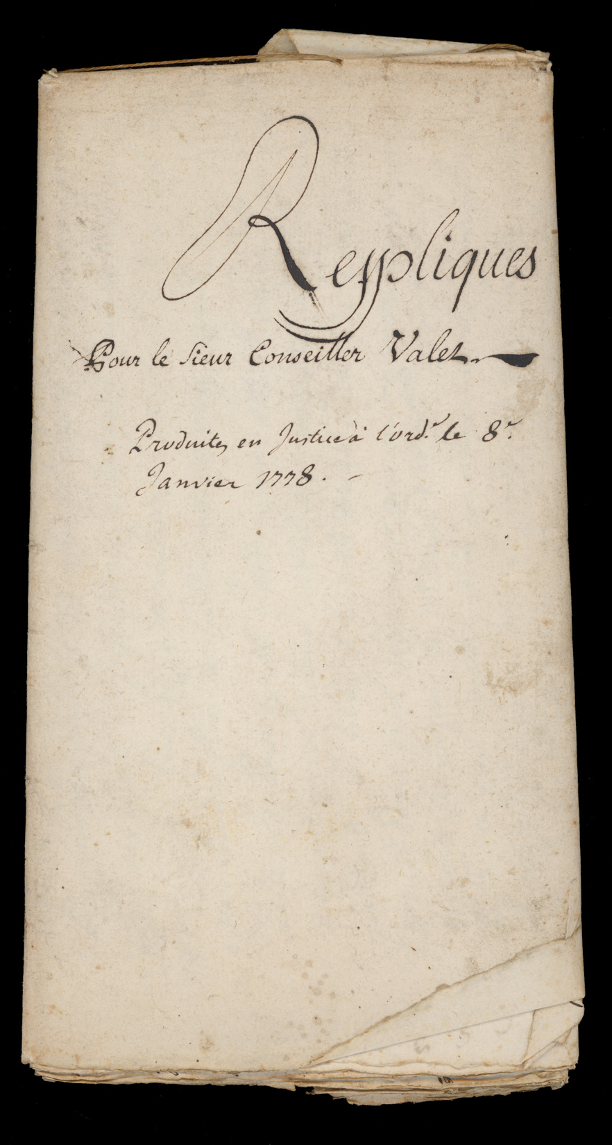 Reppliques pour le sieur Conseiller Valet contre le Tanneur Abraham Rapaz. Produite en Justice le 8 janvier 1778. Page de couverture_2Download