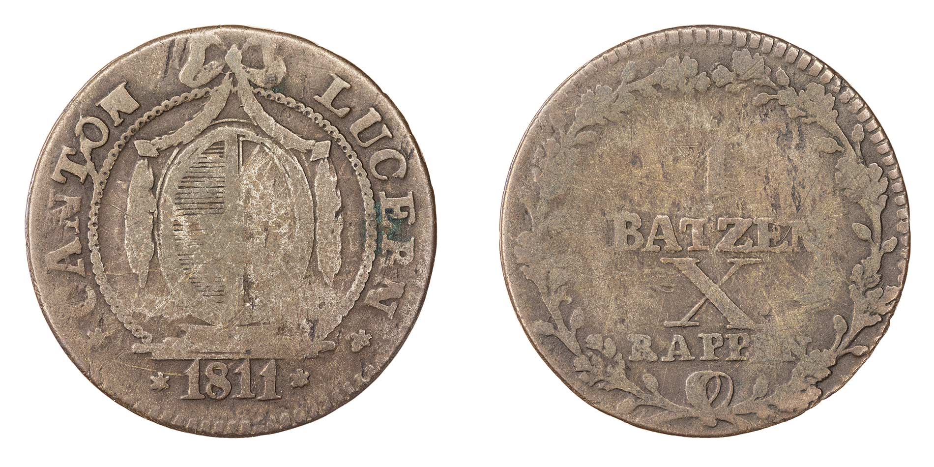 Collection Monnaies et médailles Item Pièce de un batzen = dix rappen, 1811 Document 1 batzen, 10 rappen, 1811 Download Metadonnées Thumbnail Description1 batzen = 10 rappenDénominationPièce de un batzen = dix rappen, 1811Année1811Autorité émettriceCanton de LucerneAtelier monétaire-Poids2,61 gDimensions (hauteur / largeur)24,56 / 24,46 mmÉpaisseur0,76 mmOrientationMonnaie (tête-bêche)CompositionBillonRéférencesDivo-Tobler 1969, n°65Frappe-RemarquesAvers : Armoiries de Lucerne. Écriture : Allemand. Inscription : CANTON LUCERN 1811 Revers : Valeur faciale entourée d'une couronne de feuilles de chêne attachée par un ruban. Écriture : Allemand. Inscription : I BATZEN X RAPPEN Voir : https://fr.numista.com/catalogue/pieces22822.htmlNuméro de cotePièce_Mand_0021 Continuer à naviguer Pièce de un rappen, 1846 Pièce de un batzen = dix rappen, 1622 Back to items list