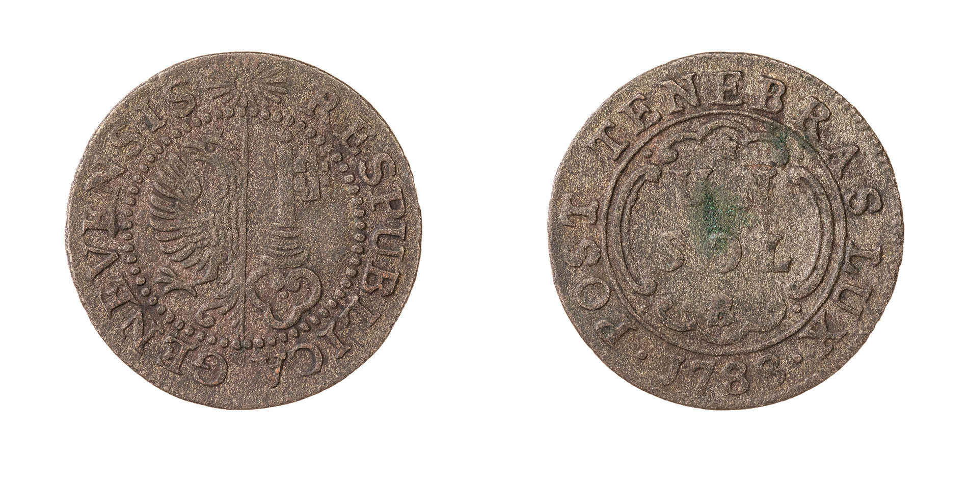 Avers : Armoiries dans un cercle, soleil au-dessus. Écriture : Latin. Inscription : RESPUBLICA GENEVENSIS