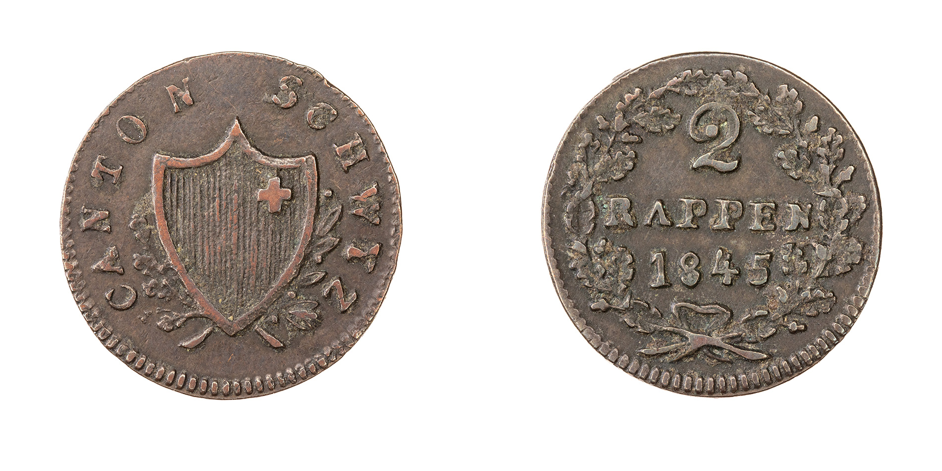 Collection Monnaies et médailles Item Pièce de deux rappen, 1845 Document 2 rappen, 1845 Download Metadonnées Thumbnail Description2 rappenDénominationPièce de deux rappen, 1845Année1845Autorité émettriceCanton de SchwytzAtelier monétaire-Poids1,17 gDimensions (hauteur / largeur)17,34 mmÉpaisseur0,86 mmOrientationMédaille (tête-tête)CompositionBillonRéférencesDivo-Tobler 1969, n°85Frappe-RemarquesAvers : Écu pointu avec lettrage autour. Écriture : Allemand. Inscription : CANTON SCHWYZ Revers : Valeur et date dans une couronne. Écriture : Allemand. Inscription : 2 RAPPEN 1845 Voir : https://fr.numista.com/catalogue/pieces23441.htmlNuméro de cotePièce_Mand_0014 Continuer à naviguer Pièce de un rappen, 1843 Pièce de deux rappen, 1846 Back to items list