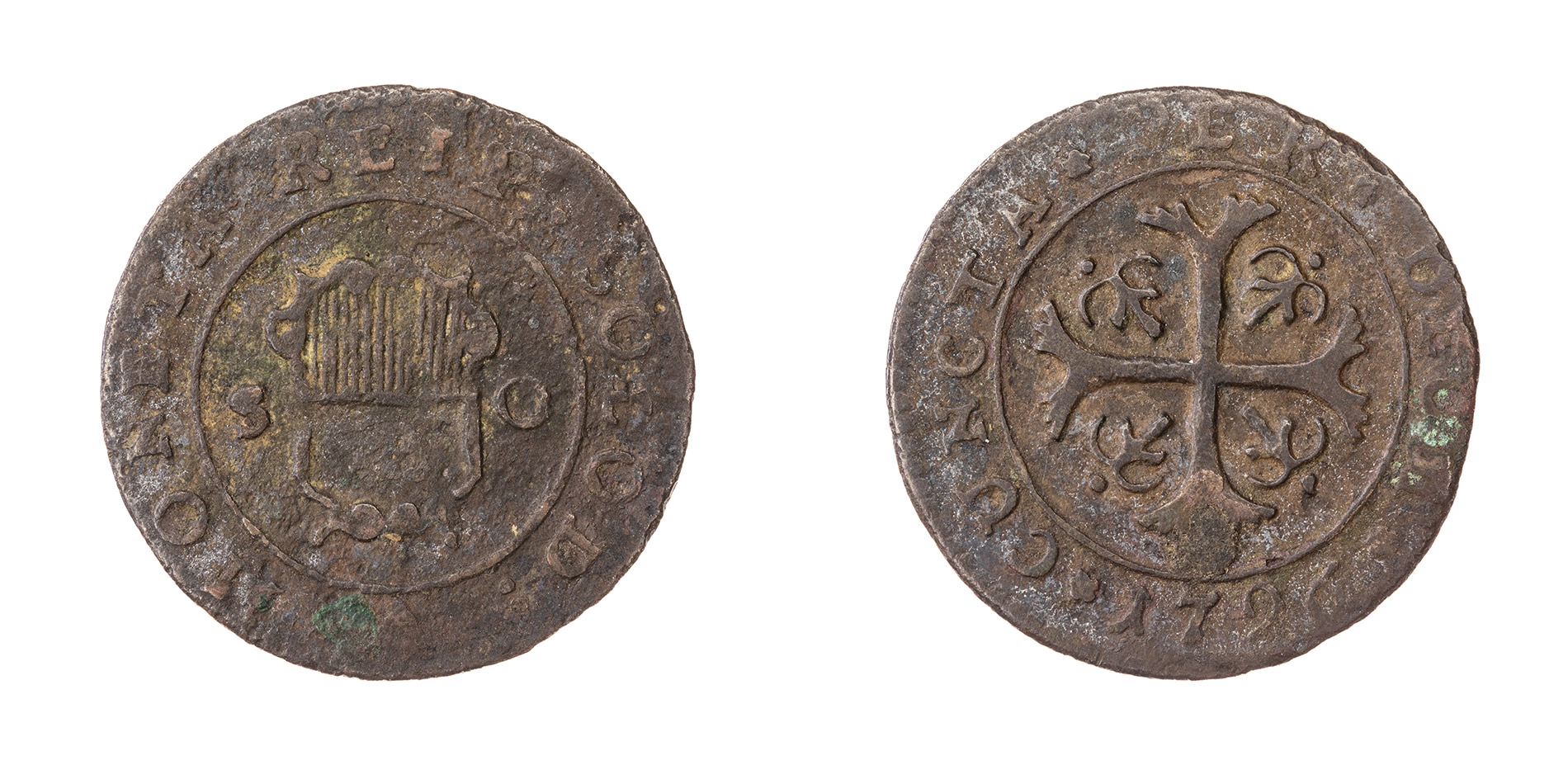 Avers : Les armoiries divisent le S O à l'intérieur du cercle. Écriture : Latin. Inscription : MONETA REIP · SOLOD : S O