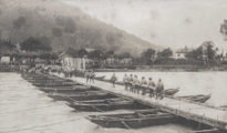 Près du village de Massongex, les pontonniers travaillent pour construire un pont flottant au-dessus du Rhône. Un groupe d'hommes manipule les planches qui constitueront le tablier du pont. L'ouvrage a déjà réussi à relier les deux rives du Rhône, unissant ainsi les cantons de Vaud et du Valais. De nombreux spectateurs observent les opérations depuis Massongex. Le pont est presque achevé. Bataillon des pontonniers n°1. Bex, août 1925Download