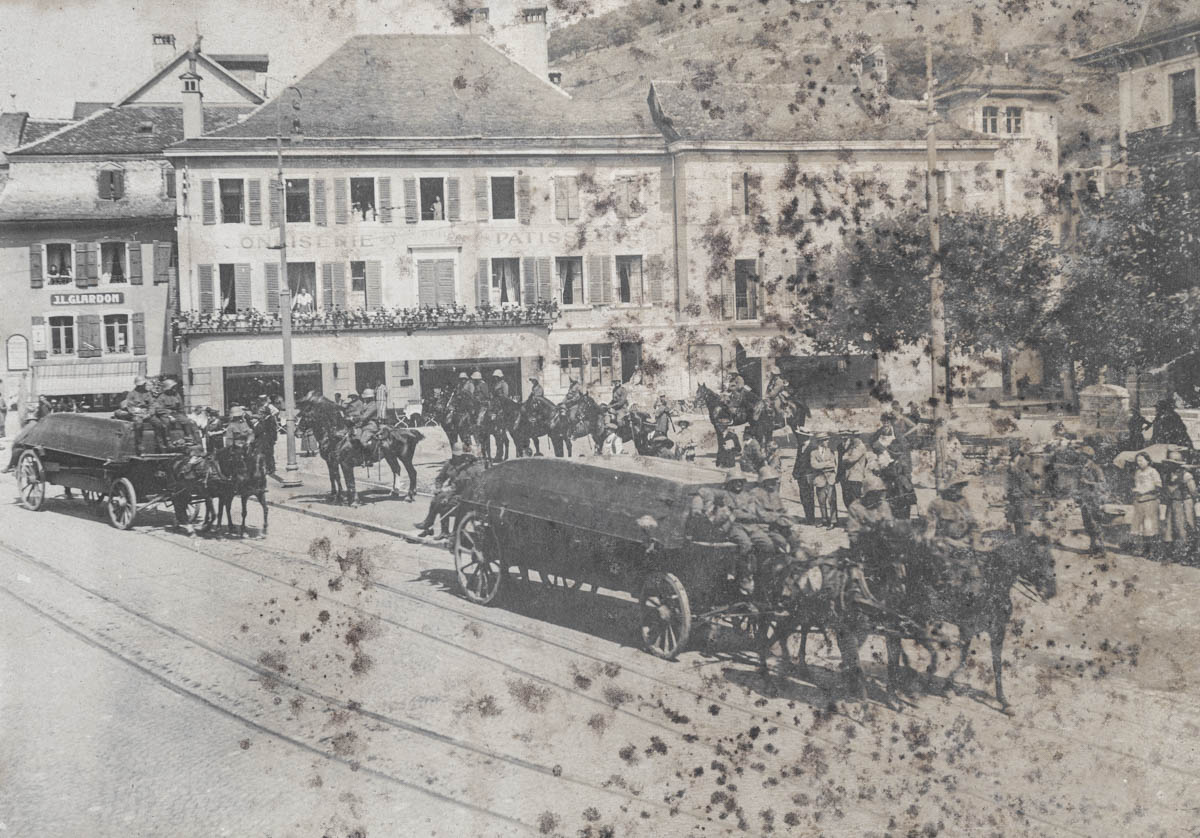 armée, barques, Bex, boulangerie, chars, chevaux, commerces, confiserie, défilé, génie, Glardon, gradés, groupe, manifestation, monument Forneret, pâtisserie, personnages, place du Marché, pontonniers, rue Centrale, scène de genre, soldats, Vernet