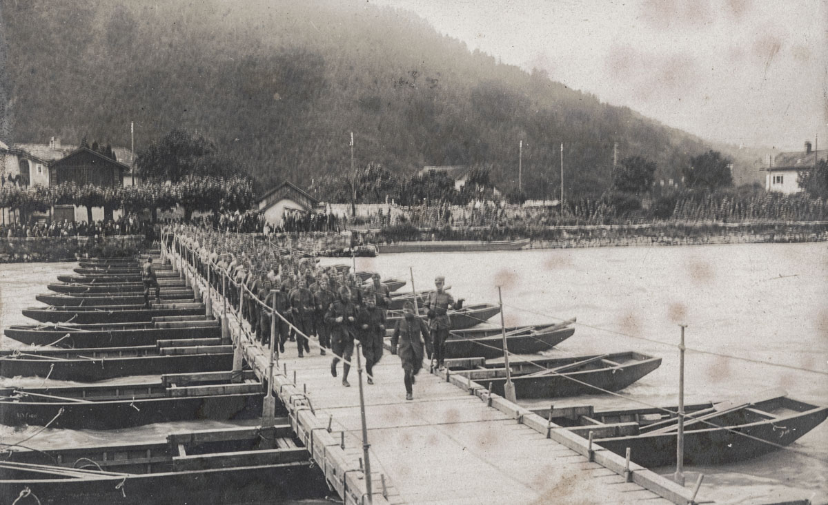 Une troupe d'environ cent militaires effectue un retour au pas de gymnastique sur le pont construit par les pontonniers entre les rives vaudoises et valaisannes du Rhône à Massongex, dans le but de démontrer la solidité de l'ouvrage. Les 13 barques, solidement retenues par des câbles, contribuent à assurer la stabilité du pont flottant. Un grand nombre de spectateurs rassemblés du côté de Massongex assistent à ce spectacle.