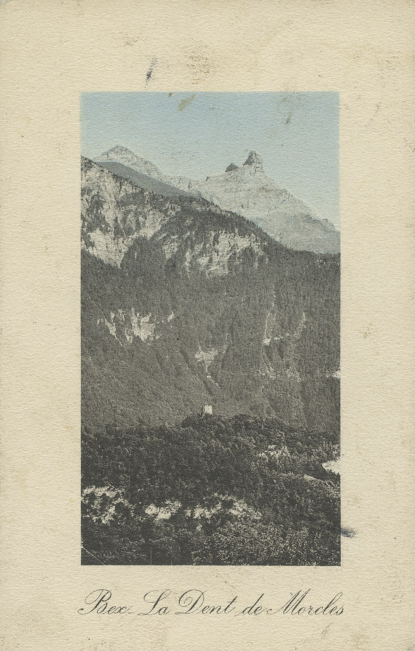 Carte postale colorisée. Vue en direction du Sud-Est. Sur la colline au premier plan on voit le sommet de la Tour de Duin que surmonte les deux pointes des Dents-de-Morcles.