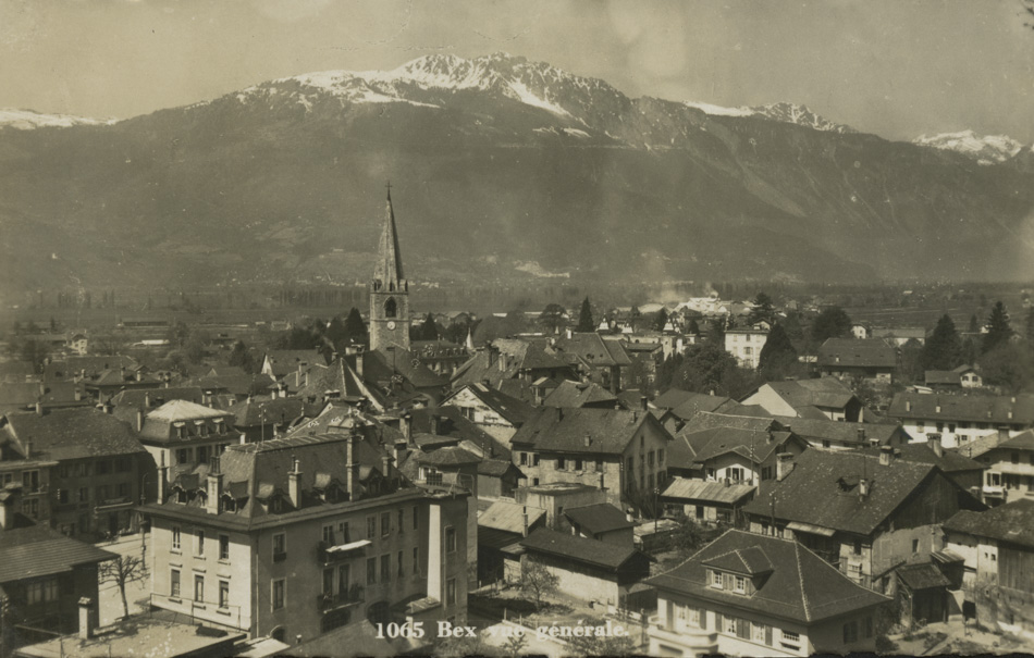 Vue générale et en hauteur du bourg de Bex en direction de l’Ouest. La place du Marché se trouve en bas à gauche face au bâtiment des Postes que l’on voit de dos. La flèche de l’église domine l’ensemble. Carte postale festonnée.