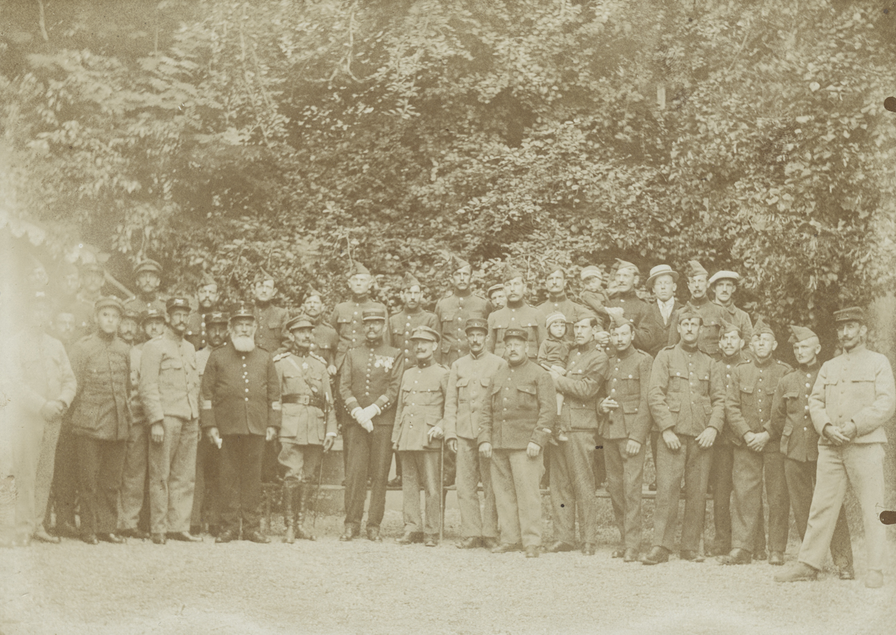 Groupe de 40 personnes, composé principalement d'hommes en uniformes militaires, ainsi que quelques civils, y compris des enfants. Le contexte et les uniformes suggèrent qu'il s'agit d'internés venus à Gryon durant la Première Guerre mondiale. Au dos de la photographie, quelques noms ont été inscrits.