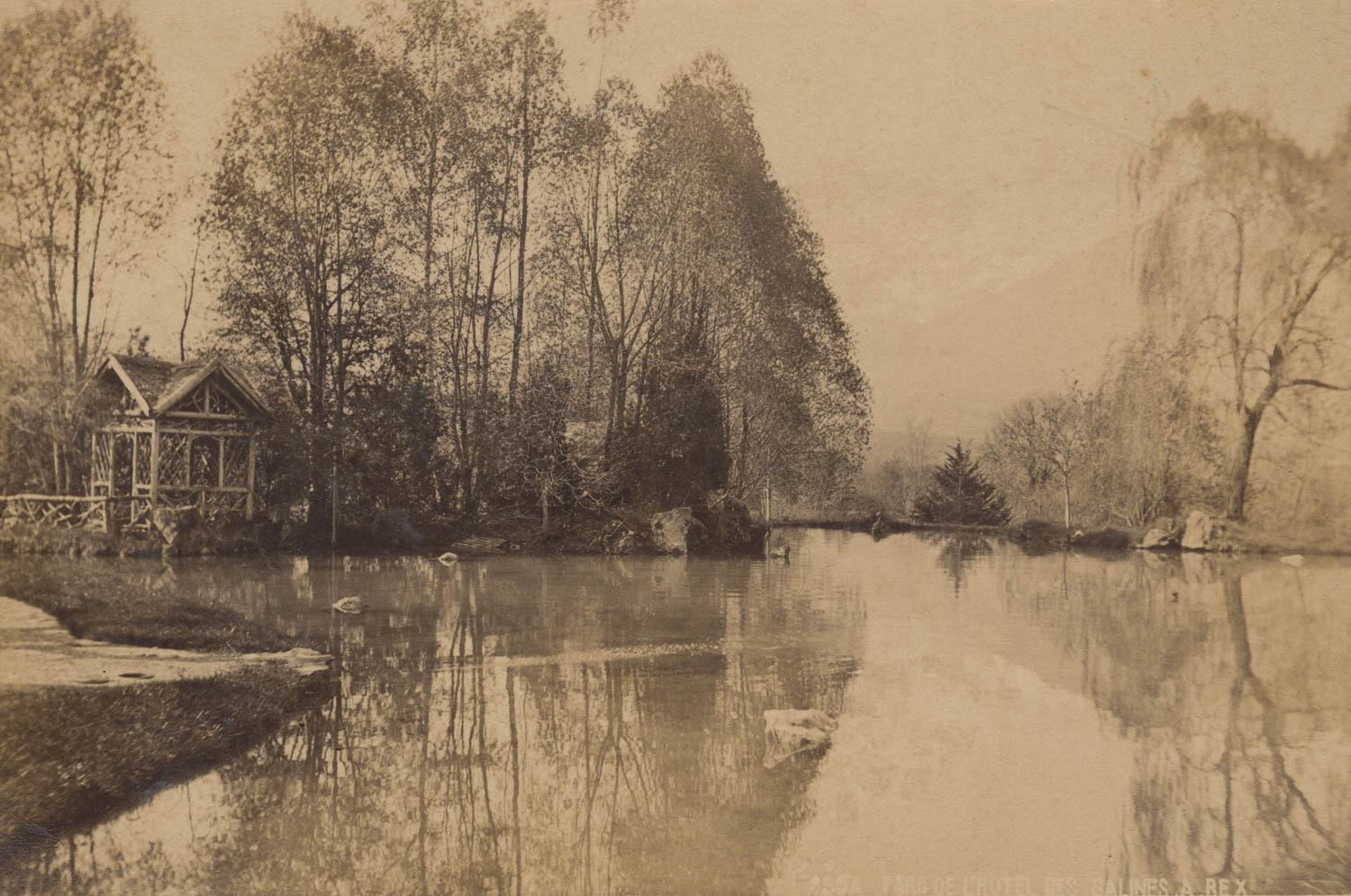 Photographie montrant l’ancien étang du parc du Grand Hôtel des Salines, à Bex, probablement réalisée vers la fin du XIXᵉ siècle. Au premier plan, la surface tranquille de l’eau reflète les arbres du rivage, créant un effet miroir. À gauche, un petit kiosque en bois de style rustique, avec sa balustrade en branches entrecroisées, se dresse parmi les feuillages. La rive est bordée d'arbres élancés, saules et arbustes, qui encadrent la scène de leurs silhouettes fines et légèrement estompées. À l’arrière-plan, on distingue la plaine et les premiers contreforts de ce qui doit être la Dent-du-Midi, fortement estompée sur cette représentation.